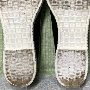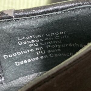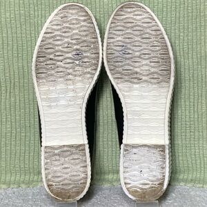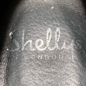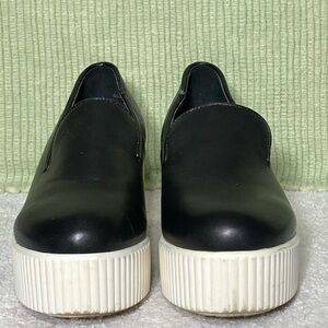 Shelly’s London Women's Black Leather Platform Slip On Shoes. Color: Black w/White. Pre-owned Condition - Refer to Pictures. No Rips or Tears. Smoke-Free. Heel is 2 1/2" from bottom to start of shoes.
