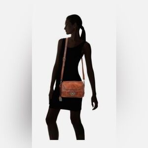 The lined interior is made of cotton and fabric, with a classic black striped lining color. The bag also boasts an outer pockets, adding to its functionality. The Cameron model has a medium size, with dimensions of 10in width, 7in height, and 2 1/2” depth. The bag is lightweight, and its handle style is a crossbody strap, which is the same color as the bag. Its stylish studded accents and the Frye brand make it a must-have.