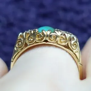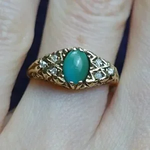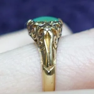 antique scrollwork with chrysoprase and accent diamonds in 9K yellow gold, the detail on this one is so. precious!