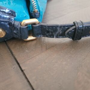 GUC Marc by Marc Jacob's teal medium swing/crossbody bag. 100% PVC, stunning deep teal/ocean blue color, bronze hardware. Some cracking on the handle(minimal) and on the very top sides of the bag, which is common with normal wear and tear on bags made with this material. Zoom into the pictures, to see any cracks. Also a few discoloration spots on the front bottom flap( also very minimal). This is a gorgeous color, cresant shape. Interior zip pocket, 2 slip pockets. The flap of the bag also has a zipper that opens for additional storage.