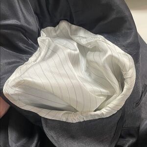 Classic men’s blazer in a versatile charcoal grey, perfect for an effortless oversized look. Tailored construction with a relaxed drape when worn slightly oversized. Features notched lapels, flap pockets, chest pocket, and a clean single-breasted silhouette. Sleeves look great cuffed to show the striped lining. Easy to dress up or down—wear with denim, trousers, or over a tee for a modern, borrowed-from-the-boys vibe.