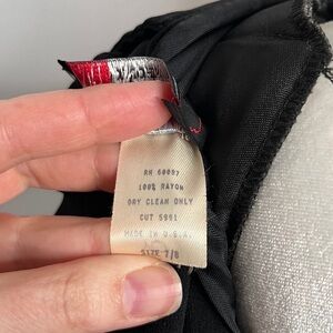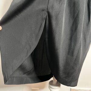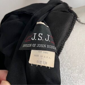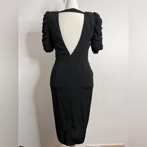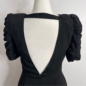 Vintage 80s J.S.J. Division of John Roberts knee length black dress with open back, statement sleeves, and front slight.