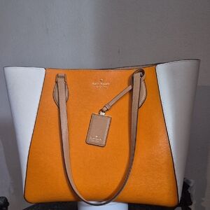 Chic Kate Spade tote with bold orange and cream panels. Ideal for everyday elegance.