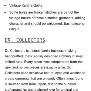 Using traditionally American manufacturing, Dr. Collectors aims to produce the highest quality clothing and accessories. All garments are constructed in California. They are designed with a sincere attention to detail, a focus on lasting construction, and each piece includes its own unique, yet subtle mark of craftsmanship.