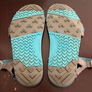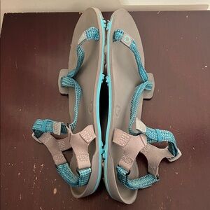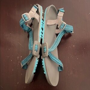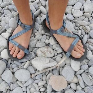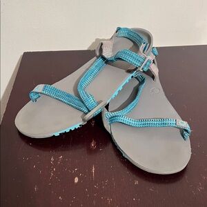 This is a fairly minimally worn/used pair of women’s Xero Shoes Z-Trail Sandals. In a grey and turquoise color scheme, these are a barefoot, minimally style hiking or camp shoes. Has the adjustable straps, good tread on the soles, subtle branding and are ultralight. Would be good for upcoming thru hikers on the Appalachian Trail, AT, Pacific Crest Trail, PCT, or Continental Divide Trail, CDT.
