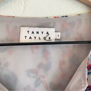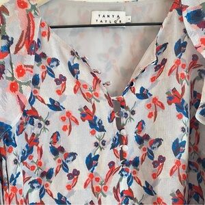 This sleeveless blouse by Tanya Taylor showcases an elegant asymmetrical ruffled design, perfect for a stylish and chic appearance. The vibrant blue and pink floral pattern adds a touch of summer charm, while the lightweight fabric ensures comfort and ease. Ideal for any occasion, this top is a must-have for a fashionable wardrobe.