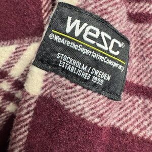 pretty maroon color. button snap closure. a great layering piece that is heavy duty and warm. a little itchy to wear on its own, but great for layering. no callouts, like new. too small for my boyfriend and me.