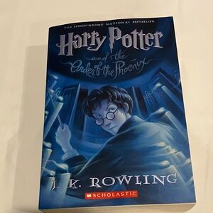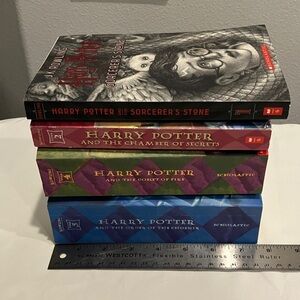 Four Harry Potter books by Scholastic. Includes 'The Sorcerer's Stone', 'The Chamber of Secrets', 'The Goblet of Fire', and 'The Order of the Phoenix'.