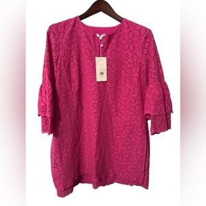 Beautiful Tyler Böe eyelet lace tunic/dress in a vibrant Cabaret pink. Features intricate floral eyelet detailing, a flattering split V-neckline, and feminine 3/4 sleeves with scalloped edges. Lightweight and perfect for spring, summer, brunch, vacations, or resort wear.