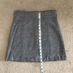 Reformation Oak mini skirt in Washington houndstooth plaid. This high-waisted mini skirt features a black and white micro houndstooth plaid pattern, a back zip closure, and an A-line silhouette with two hem notches. Unlined with forgiving stretch.