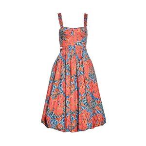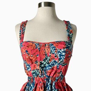 Crafted in 100% cotton, this Olympia dress offers breathable softness with a lightweight feel, ideal for warm-weather wear. Featuring a vibrant abstract “Flamingo” print in pink, red, and blue, the design highlights Ulla Johnson’s signature mix of bohemian artistry and modern femininity. The fitted bodice and wide straps lead to an open back cutout and a gathered skirt with a distinctive balloon hem for added volume and playful structure. Perfect for summer parties, vacations, and special occasions, this dress balances elegance with effortless ease.