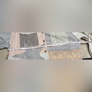 Unique patchwork design with floral and star patterns. Features pink, cream, and gray tones. Perfect for a stylish look.