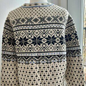 A vintage L.L.Bean classic, crafted in pure lambswool with intricate Scandinavian motifs and pale blue accents. Weighty and naturally insulating — a heritage-inspired knit produced in the early 2000s, echoing traditional Norwegian craftsmanship. The sleeve cuffs can be worn two ways to reveal contrasting bands, underscoring its thoughtful finish. Exceptional condition and beautifully made.