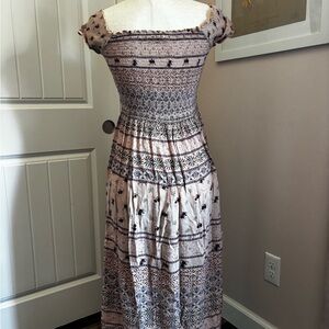 Vintage, lightweight midi dress with intricate pink and lavender floral patterns. Smocked chest and cap sleeves make this perfect for layering, whether you’re headed to a museum, cafe, or day at the beach.