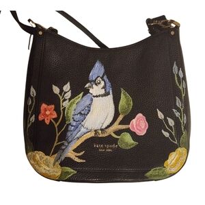 Chic and stylish, this Kate Spade bag features a beautiful floral & blue Jay painting on a classic black background. Perfect for adding a touch of elegance to any outfit. This bag is truly one of a kind as designs are never duplicated.
