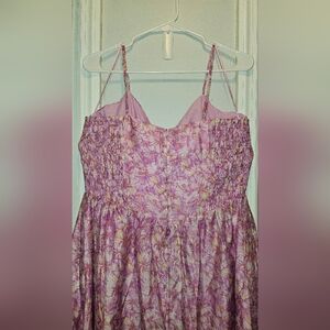 Features: Adjustable straps, shirred detail at bust, tie detail on front, fitted corset style bodice, zipper closure down back, full maxi skirt, size L (loose fit)