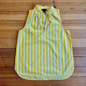 J. Crew ruffle neck top in wide-stripe cotton poplin. Size 2. Excellent condition. Beautiful yellow, bright sun. Rounded hem, slightly longer in back. Comfy crisp cotton. Missing top button tab. Stock pics for style reference.