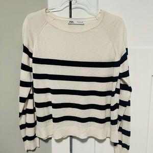 Excellent Condition (EUC) Zara off-white (cream) and black striped knit sweater. This versatile and stylish crewneck pullover is a perfect closet staple and casual piece for any season.