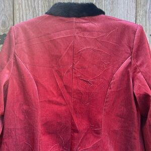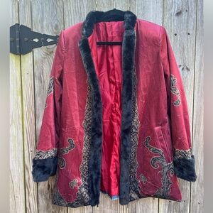Vintage Red Velour Faux Fur Trim Artsy Design Open Coat Jacket Women’s Medium