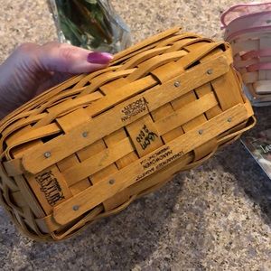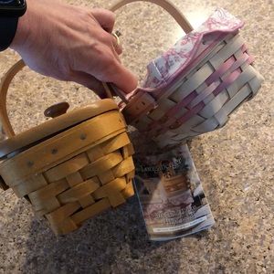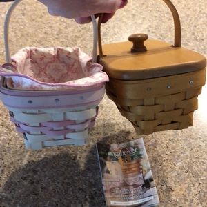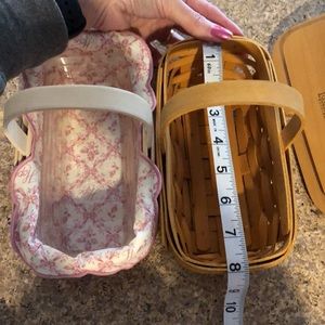 Bundle of 2 Longaberger Horizon of Hope 2000 Baskets. I had these on display on top of a cabinet and then had them stored for years after that. This bundle includes a white wash basket with liner and protector and a regular stain basket with maple lid/cover. There isn’t a protector or liner in the regular stain one. These are beautiful quality maple baskets. They are too beautiful to keep stored so I’m selling. Since they are preowned and have age they may have minor imperfections. Measurements are approximate and colors may be off because of lighting. 1 product card included.