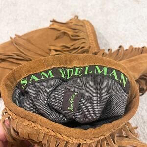 Elevate your bohemian style with these Sam Edelman Utah Mid-Calf Fringe Moccasin Boots. These slip-on boots feature a pointed toe, flat heel, and a comfortable fit for casual occasions. The brown suede leather upper with fringed accents adds a touch of vintage to your wardrobe.