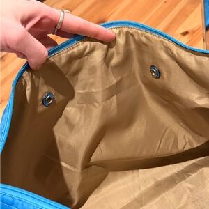 Stylish Coach tote with matching pouch. Vibrant blue design. Perfect for any weekend trips, it’ll fit a lot!! The small pouch snaps in place and can be used separately. Has the original hang tag. COMPLETE SET. You can stuff the big bag into the smaller one for easier storage as well! Measurements are approximate*