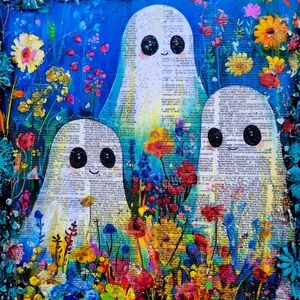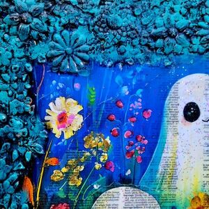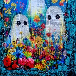 Ghosts In Wildflower Field Large 16x20 Canvas Mixed Media Art Creepy Cute Decor