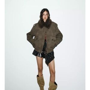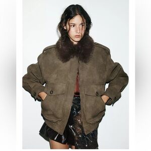 NWT ZARA VIRAL FAUX SUEDE JACKET WITH REMOVABLE COLLAR S| KHAKI 🚨FIRM PRICE