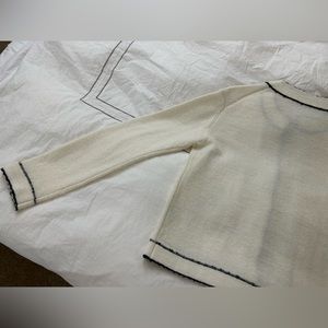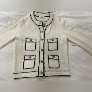 This lovely cardigan has been worn once for a short time and is still in excellent condition. The loop for the second button is slightly loose. It has been hanging in my closet, so there may be some very light creasing around the shoulders. Please refer to the photos for details.