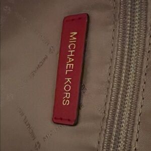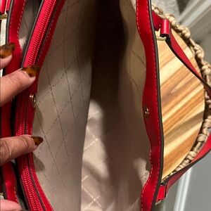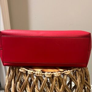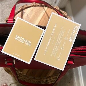 Chic and bold red tote by Michael Kors. Features sleek design and signature charm.
