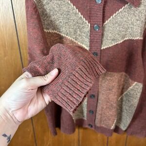 Keywords: BonWorth cardigan, patchwork sweater, petite knitwear, vintage style, earth tones, button front, collared sweater, casual wear, fall fashion, cozy, textured knit, boho, vintage sweater