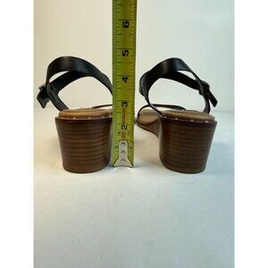 FEATURES/ACCENTS: Wedge heel height is about 2 inches. Open toe style. Black upper, brown (or wood-look) sole. Adjustable slingback strap with a buckle closure. Studded trim around the base of the sole adds a subtle edge