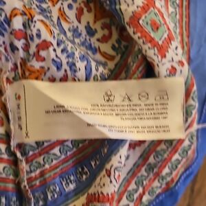 Stylish bohemian print tunic dress with vibrant patterns. Features a mix of blue, orange, and brown cohome.