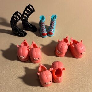 Collection of stylish Rainbow High doll shoes. Includes black spiral heels, blue boots with red accents, and pink animal-themed slippers. Perfect for doll fashion enthusiasts. See pictures