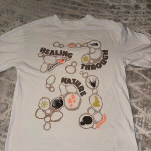 A cream/off-white short-sleeve T-shirt with a round crew neckline and a relaxed, casual fit. The front features a nature-inspired graphic design in warm earthy tones (brown, beige, yellow, and soft orange). The print includes abstract shapes, footprints, plants, and outdoor symbols, with the phrase “Healing Through Nature” arranged across the design.