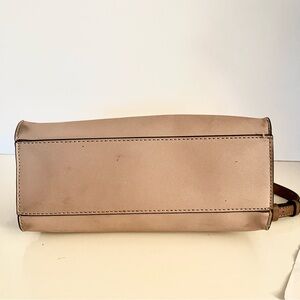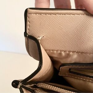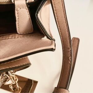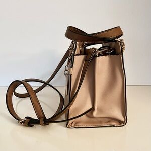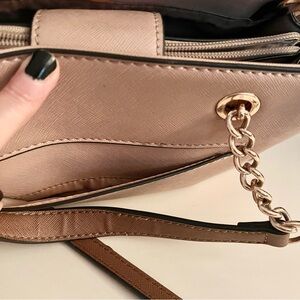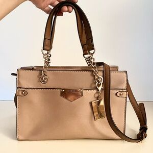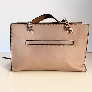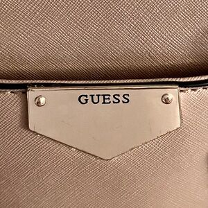 Elegant and structured Guess satchel in a timeless nude-beige saffiano (vegan leather) finish with gold-tone chain and hardware accents. Can be carried by top handles or worn as a crossbody, removable and adjustable strap. Guess logo plate and hanging key charm. Zip top closure with spacious interior and organizational pockets. Condition: Very good preowned condition. Light cosmetic wear consistent with normal use, including minor corner scuffing and small interior edge wear at the opening (not visible when carried). Hardware shows light surface marks. All details are shown clearly in photos. Clean interior, holds shape beautifully and still looks gorgeous when worn.