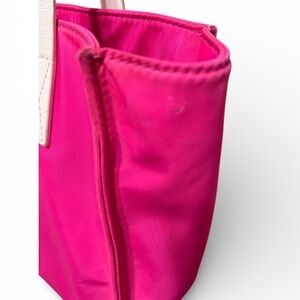 Material: Crafted from pink nylon with white leather dual handles.