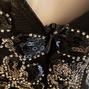 FEATURES: Fully beaded front, sheer mesh yoke, V-back, sleeveless, scalloped hem, fringe trim, zip closure, fully lined