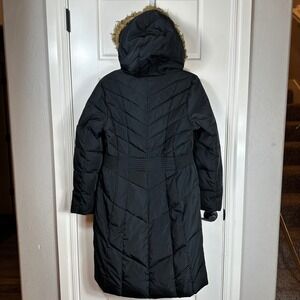 Keywords: Puffer coat, Quilted jacket, Faux fur hood, Winter coat, Down fill, Chevron pattern, Mid-length coat, Warm outerwear, Signature collection, Black coat, Full zip, Elastic waist