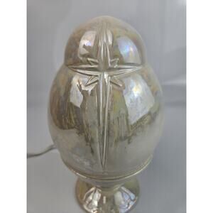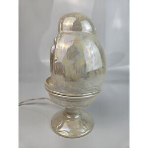 This Nativity scene is a beautifully crafted irredescent ceramic figurine depicting Jesus, Mary and Joseph. In great condition, the soft blue light and cream irredescent finish makes a beautiful and soft glow illuminating the family.