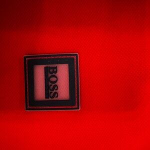 Vibrant red HUGO BOSS polo with a neat collar. Features a BOSS logo patch on the chest. Perfect for everyday style.