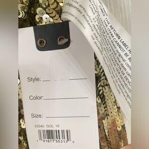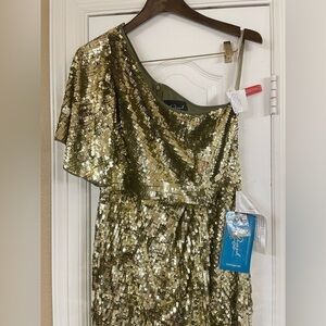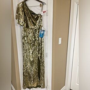 Gorgeous one-shoulder bell sleeve gown is fully embellished with metallic gold sequins and features a sexy thigh-high slit.