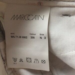 This unique, stylish white denim skirt features an artistic print in shades of red and black. Perfect for adding a unique touch to your wardrobe. Excellent preowned condition, no flaws.
