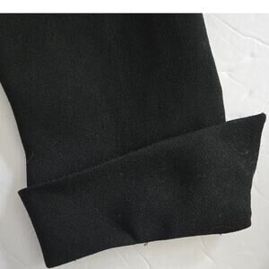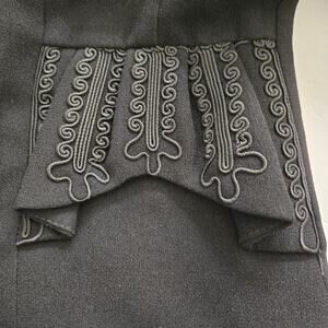 Black crepe material, spread collar with decorative braid trim, statement silver-tone buttons, scalloped soutache accents on faux pockets. Slightly cropped, softly structured shape. Long sleeves with rolled cuff. Fully lined. Modern vintage piece with 1940's-inspired style. Made in the USA.
