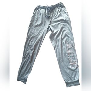 Light gray joggers with side text. Soft fabric and adjustable drawstring waist. Ideal for lounging or casual outings. Excellent used condition without rips or stains. Measurements are in my photos.