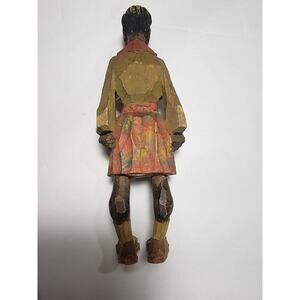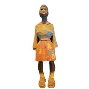 The product is a set of two hand-carved wooden figurines by artist Adrian R. Woodall. These figurines, depicting a male and a female, are small in size and painted in multicolor. Signed by the artist, these folk art pieces showcase intricate carvings and are original productions. Made in the United States, these sculptures are a unique addition to any art or Americana collection. Each figurine stands at 6.25 inches tall and 2 inches wide, making them a charming and detailed decorative accent for any space.