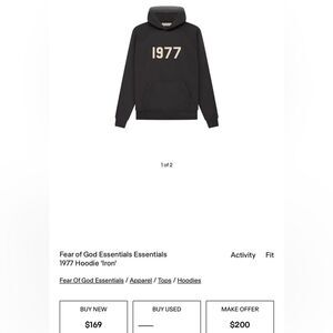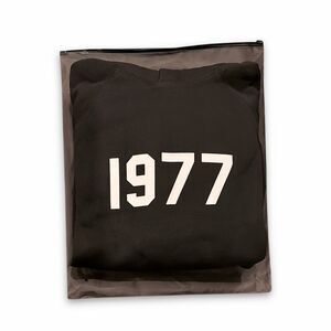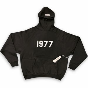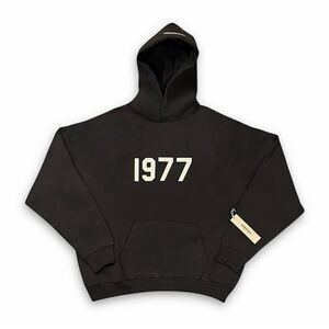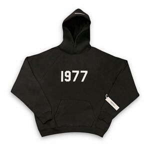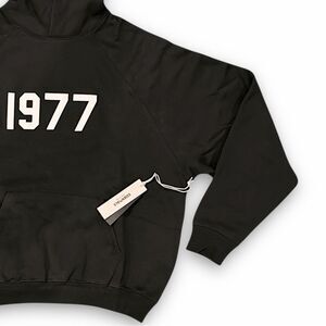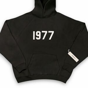 This Fear of God Essentials sweatshirt is detailed with "1977" on the front, referencing the birth year of brand founder Jerry Lorenzo. The pullover is topped with a hood.