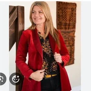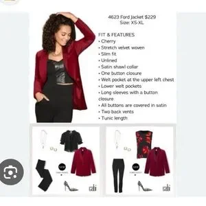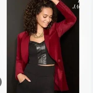 Luxurious red velvet blazer by CAbi. Perfect for adding elegance to any outfit. Ideal for both formal and casual settings.