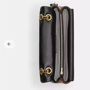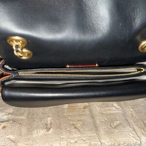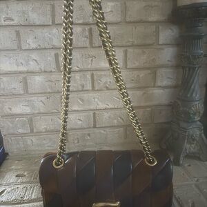 Stylish leather shoulder bag with gold hardware. Features a unique tri-tone design.
