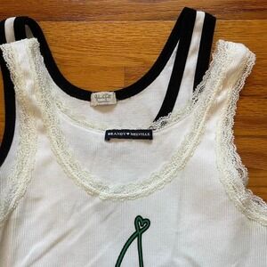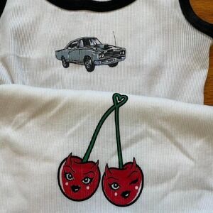 ๐ lot of 2 cutieeee ribbed white graphic cropped tanks ๐ brandy melville tank with anthropomorphic cherries and lace trim + john galt classic car/motor show and black trim